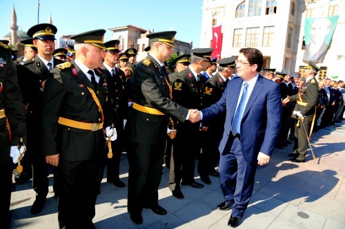 Tören sonrası Aksaray Valisi Şeref Ataklı beraberinde Garnizon ve İl Jandarma Komutanı Albay Levent Ölmez ve Belediye Başkanı Haluk Şahin Yazgı ile Valilik Makamında tebrikleri kabul etti.