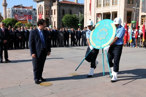 Tören, Aksaray Valisi Şeref Ataklı, Garnizon ve İl Jandarma Komutanı Albay Levent Ölmez, Belediye Başkanı Haluk Şahin Yazgı’nın Atatürk Anıtına çelenk koyması ile başladı.