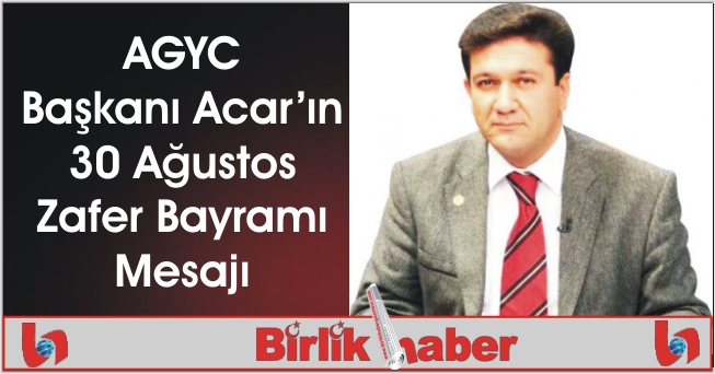 Aksaray Gazeteciler ve Yazarlar Cemiyeti Başkanı Celil ACAR, 30 Ağustos Zafer Bayramı ve Türk Silahlı Kuvvetleri Günü Münasebetiyle Bir Kutlama Mesajı Yayınladı AGYC Başkanı Acar mesajında;” Kurtuluş Savaşımızı tarihte eşi benzeri görülmemiş bir zaferle taçlandıran, her aşaması vatanperverlik ve kahramanlık destanlarıyla dolu 30 Ağustos Zafer Bayramının 94’üncü yıldönümünü bu yıl buruk aynı zamanda milletçe birlik ve beraberlik içerisinde kutluyoruz. Kahraman Türk Ordumuzun, Başkomutan Gazi Mustafa Kemal Atatürk’ün önderliğinde, bağrından çıktığı yüce Türk milletiyle bir bütün olarak verdiği destansı mücadelenin sonunda, tarihe altın harflerle yazdırdığı büyük zafer, tarihe gömülmek istenen bir milletin, adeta küllerinden yeniden doğuşunun destanıdır.