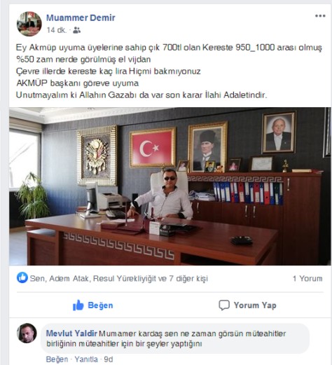 Muammer Demir sosyal medyasında yaptığı paylaşımda; Ey Akmüp uyuma üyelerine sahip çık 700tl olan Kereste 950_1000 arası olmuş %50 zam nerde görülmüş el vijdan Çevre illerde kereste kaç lira Hiçmi bakmıyonuz AKMÜP başkanı göreve uyuma Unutmayalım ki Allahın Gazabı da var son karar İlahi Adaletindir.