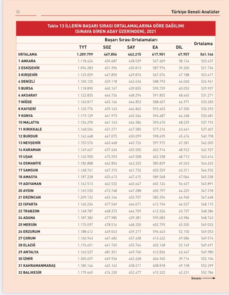 Şırnak, Ardahan, Artvin ve Hakkâri’nin ise en düşük ortalamaya sahip iller olduğu hesaplandı. Şırnak’tan YKS’ye girenlerin 614 bin 163 başarı sıralaması ortalamasına, Ardahan’dan girenlerin 616 bin 621 ortalamaya, Artvin’den girenlerin 621 bin 877 ortalamaya, Hakkâri’den girenlerin ise 628 bin 217 ortalamaya sahip olduğu belirlendi.