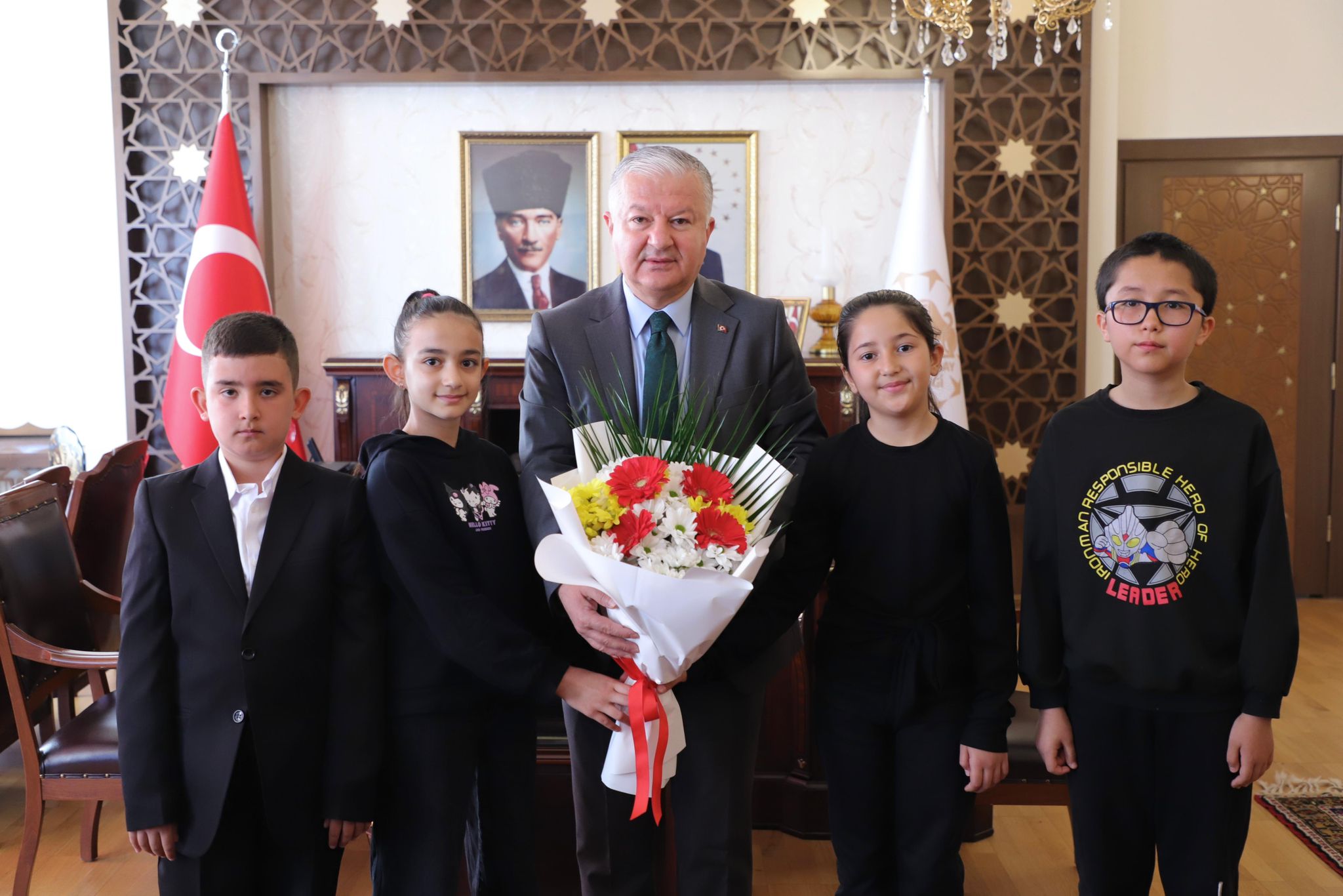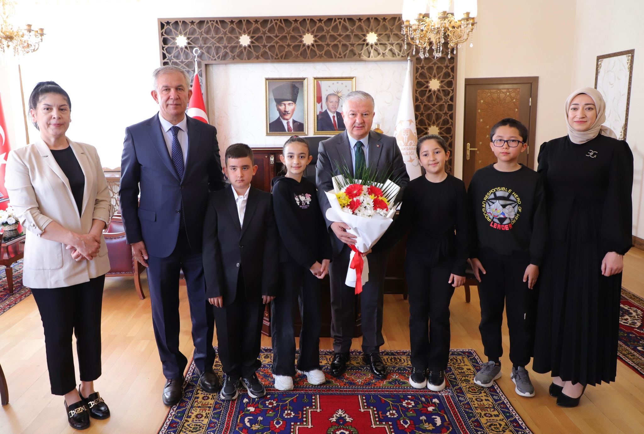 Vali Duru, 23 Nisan Ulusal Egemenlik ve Çocuk Bayramı kapsamında İl Milli Eğitim Müdürü Metin Alpaslan ile Hacı Cumali Uğur İlkokulu öğretmen ve öğrencilerini makamında kabul etti.