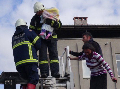 Aksaray’da iki katlı bir binanın birinci katında çıkan yangında adeta can pazarı yaşandı. Daire alevler içinde yanarken, 4 aylık bir bebek vatandaşlar ve sağlık ekiplerinin balkona dayadığı merdivenle kurtarıldı. Dumandan zehirlenen bebek hastaneye kaldırılırken, yangında 3’ü çocuk 5 kişi zehirlendi.