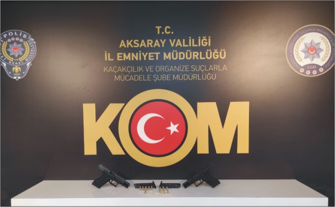 Aksaray Cumhuriyet Başsavcılığı Koordinesinde ilimiz genelinde kaçakçılık olaylarının önlenmesi amacıyla Kaçakçılık ve Organize Suçlarla Mücadele Şube Müdürlüğünce yapılan kapsamlı çalışmalarda; Durumundan şüphelenilerek durdurulan araç içerisinde yapılan aramada, 2 adet ruhsatsız tabanca, 15 adet fişek ve 2 adet şarjör ele geçirilmiştir. Araç sürücüsü H.B.(29) hakkında adli işlem yapılmıştır.