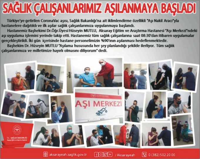 Aksaray Eğitim ve Araştırma Hastanesi Başhekimi Dr.Öğr.Üyesi Hüseyin MUTLU, Aksaray Eğitim ve Araştırma Hastanesi “Aşı Merkezi”ndeki aşı uygulama işlemini yerinde takip etti. Hastanedeki tüm sağlık çalışanlarına saat 08:30’dan itibaren uygulamalar gerçekleştirildi. İki gün içerisinde hastane personelinin %90’ının aşılanması hedefleniyor.