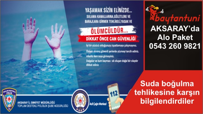 Aksaray Emniyet Müdürülüğünden yapılan açıklamada; Yaz mevsimi döneminde artan sıcaklıklar nedeniyle başta çocuk ve gençlerimiz olmak üzere birçok vatandaşımız göl, baraj, gölet, kanal ve su birikintilerinde boğularak hayatlarını kaybetmektedirler. Bu tür kötü sonuçların önüne geçebilmek için Toplum Destekli Polislik Şube Müdürlüğümüz tarafından ilimizde suda boğulma olaylarını önleyebilmek ve halkımızda bu konuda farkındalık oluşturabilmek için vatandaşlarımızın yoğun olduğu; alışveriş merkezleri, otogar, muhtarlıklar, kent pazarları vb. yerlerde broşür dağıtımı yapılarak bilgilendirme çalışmaları yapılmıştır. Ayrıca ilimiz merkezinde farklı noktalarda bulunan ilan panolarına da bilgilendirici afişler asılmıştır.