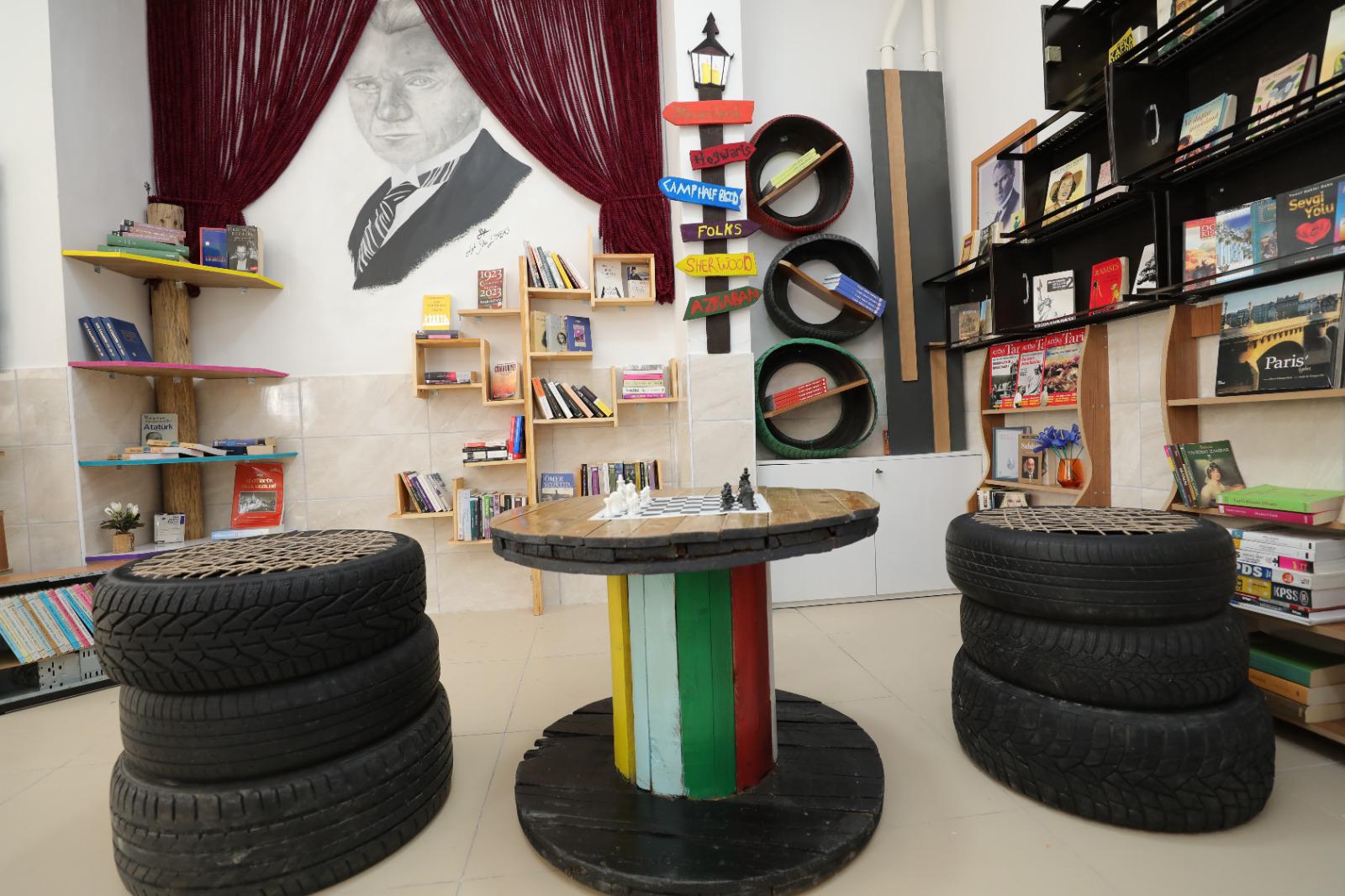 Eski bilgisayar kasaları, paletler, kablo makaraları, araba lastikleri eski ahşap mobilyaları değerlendirerek kitap raflarına, oturma alanlarına dönüştüren öğretmen ve öğrenciler içinde bulunmaktan büyük keyif aldıkları bir kütüphane yaptı.