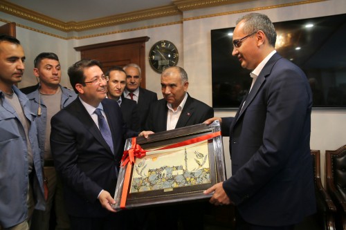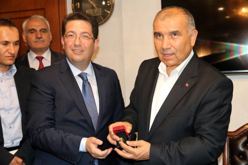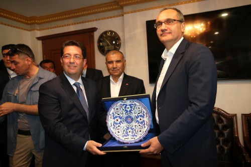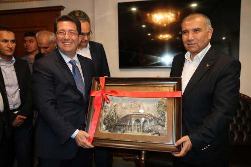 Bir dizi ziyaret ve incelemelerde bulunmak üzere memleketleri Aksaray’a gelen Gümrük ve Ticaret Bakanı Cenap Aşçı ve Enerji ve Tabii Kaynaklar Bakanı Ali Rıza Alaboyun, Ak Parti Grup Başkan Vekili ve Aksaray Milletvekili İlknur İnceöz, Aksaray Milletveki Nevzat Palta, Vali Şeref Ataklı ve beraberindeki heyetle birlikte Aksaray Belediye Başkanı Haluk Şahin Yazgı’yı makamında ziyaret etti.