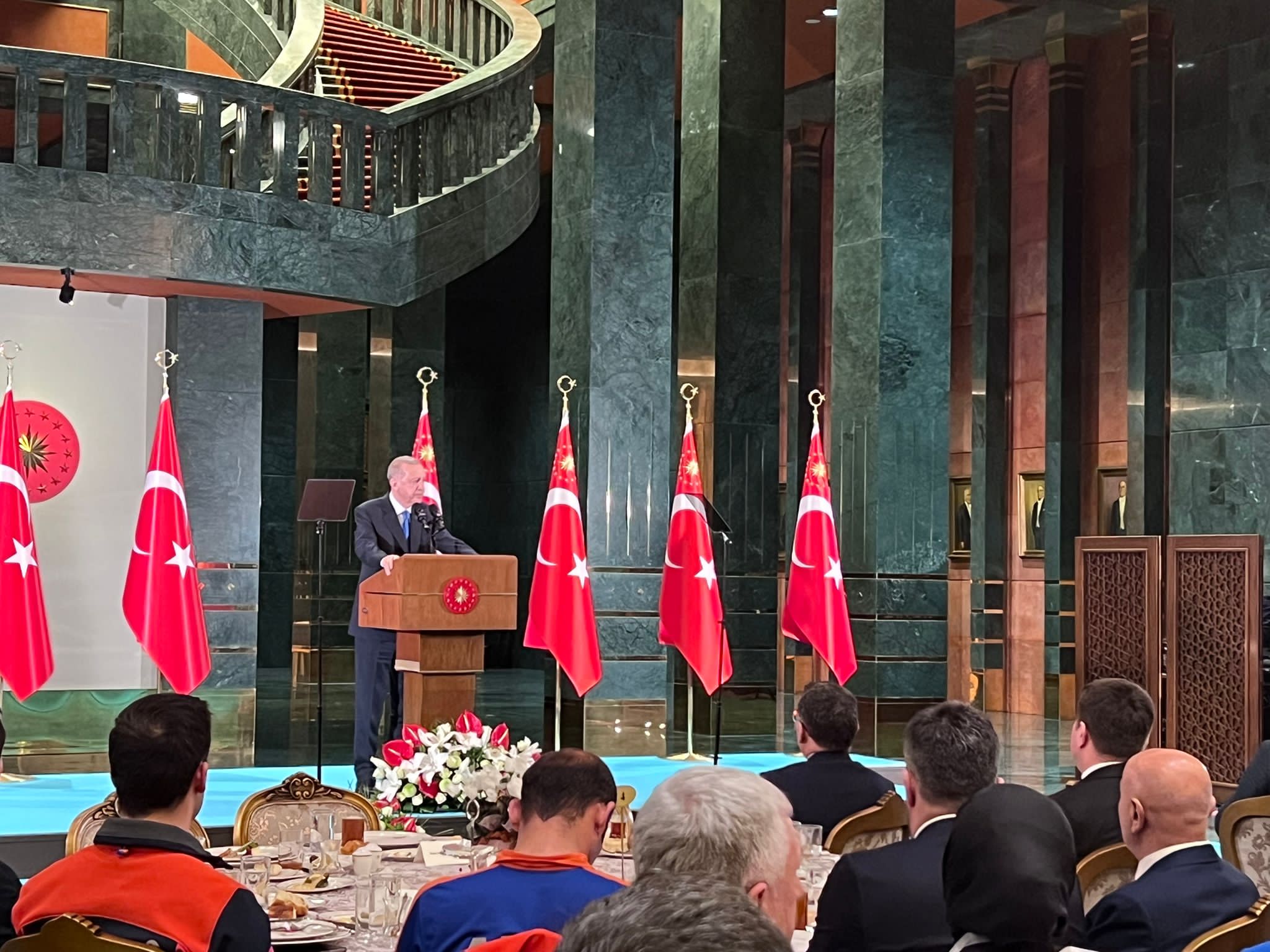 Cumhurbaşkanlığı Külliyesi’nde, depremzedeler ve deprem bölgesinde görev yapan belediye başkanları için iftar programı düzenlendi. Cumhurbaşkanı Erdoğan’ın önderliğinde düzenlenen programda, deprem bölgesinde görev yapan Belediye Başkanları ve depremzedeler aynı iftar masasında buluştu.