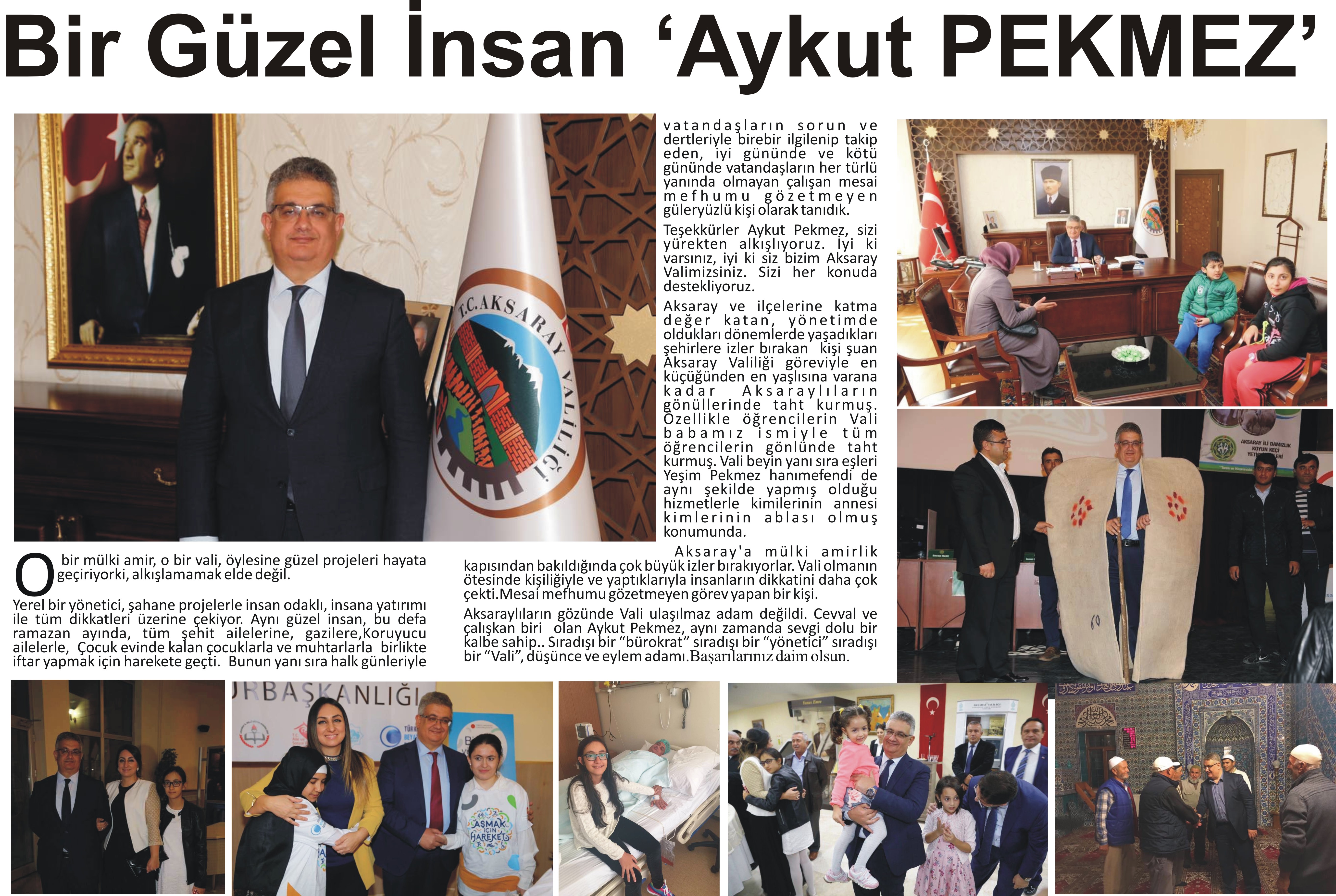 Aksaraylıların gözünde Vali ulaşılmaz adam değildi. Cevval ve çalışkan bir olan Aykut Pekmez, aynı zamanda sevgi dolu bir kalbe sahipti. Sıradışı bir “bürokrat” sıradışı bir “yönetici” sıradışı bir “Vali”, düşünce ve eylem adamı.