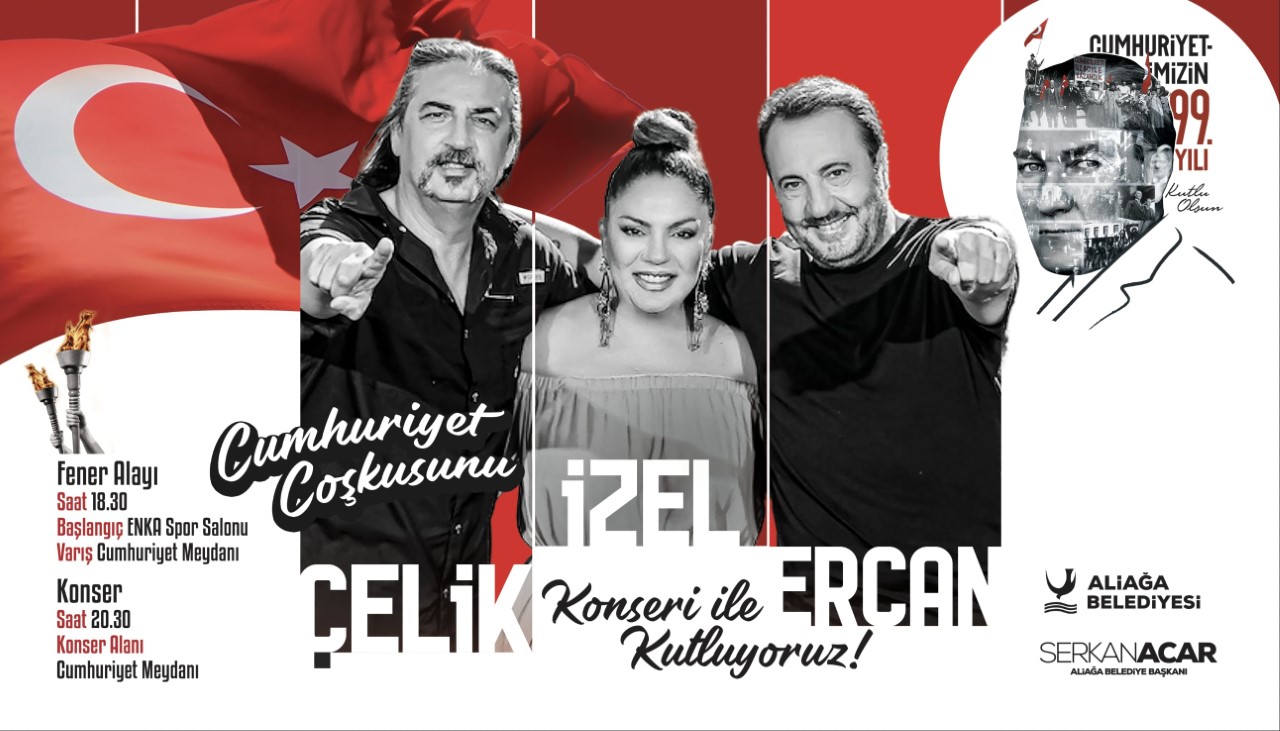 İzmir- Aliağa Belediyesi 29 Ekim Cumhuriyet Bayramı’nın 99.yılını her yıl olduğu gibi bu yılda coşkuyla kutlayacak. Kutlamalar kapsamında binlerce Aliağalının katılımıyla gerçekleştirilecek fener alayı ve kortejin ardından Cumhuriyet Meydanı’nda sahne alacak olan İzel-Çelik-Ercan, en güzel şarkılarıyla cumhuriyet coşkusunu ikiye katlayacak.