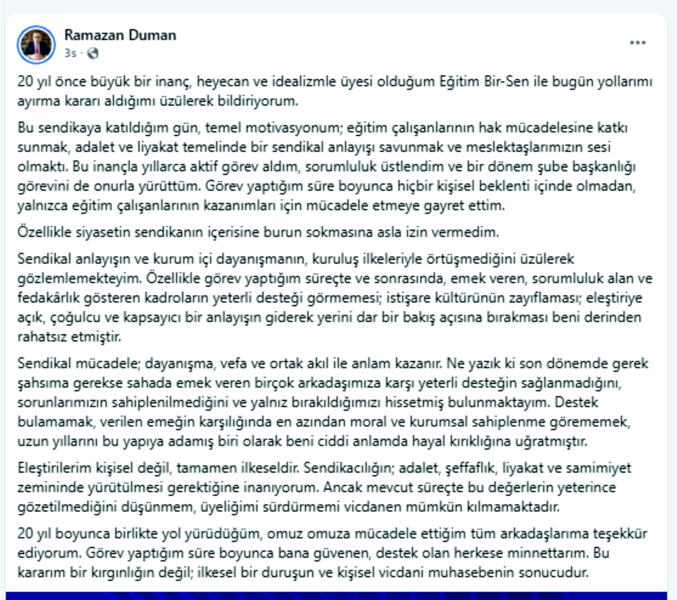 Eğitim Bir-Sen’de 20 yıl boyunca aktif görev alan ve bir dönem şube başkanlığı yapan bir isim olan Ramazan Duman , sendika üyeliğinden ayrıldığını duyurdu. “Eğitim Bir-Sen yönetimi güven kaybediyor” vurgusuyla yapılan açıklama, sendika içinde yeni bir tartışmanın fitilini ateşledi.