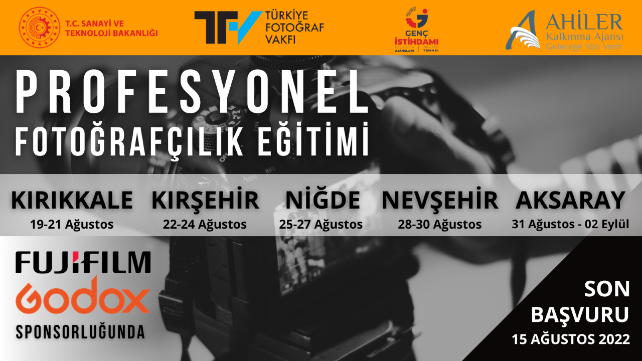 Ahiler Kalkınma Ajansı (AHİKA) tarafından “Kalkınma Ajansları 2022 – 2023 Genç İstihdamı Teması” kapsamında düzenlenecek olan “Profesyonel Fotoğrafçılık Eğitimi”, 19 Ağustos – 02 Eylül 2022 tarihleri arasında Aksaray, Kırıkkale, Kırşehir, Nevşehir ve Niğde illerinde gerçekleştirilecek.