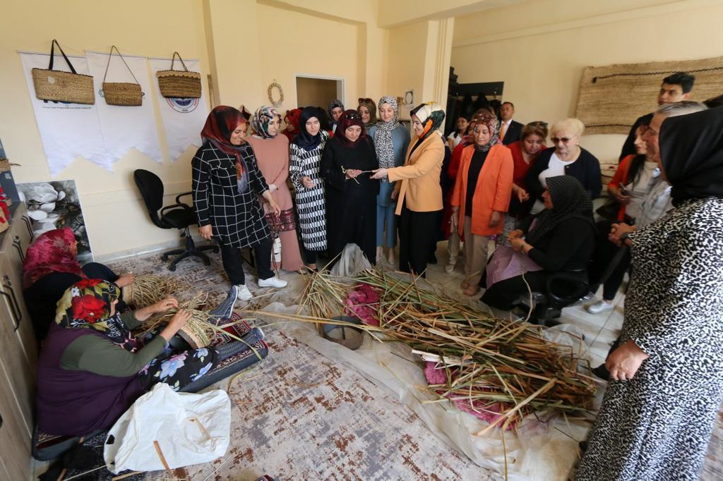 Aydoğdu ve beraberindeki heyet İlçe Sosyal Yardımlaşma ve Dayanışma Vakfından desteklenen kadınlar için İlçe Kaymakamlığı tarafından hazırlanan projelerin hayata geçirilerek; üretmeyi, ürettiklerini satarak aile bütçelerine destek sağlamaya başlayan kadınların başarı hikâyelerini dinlediler.