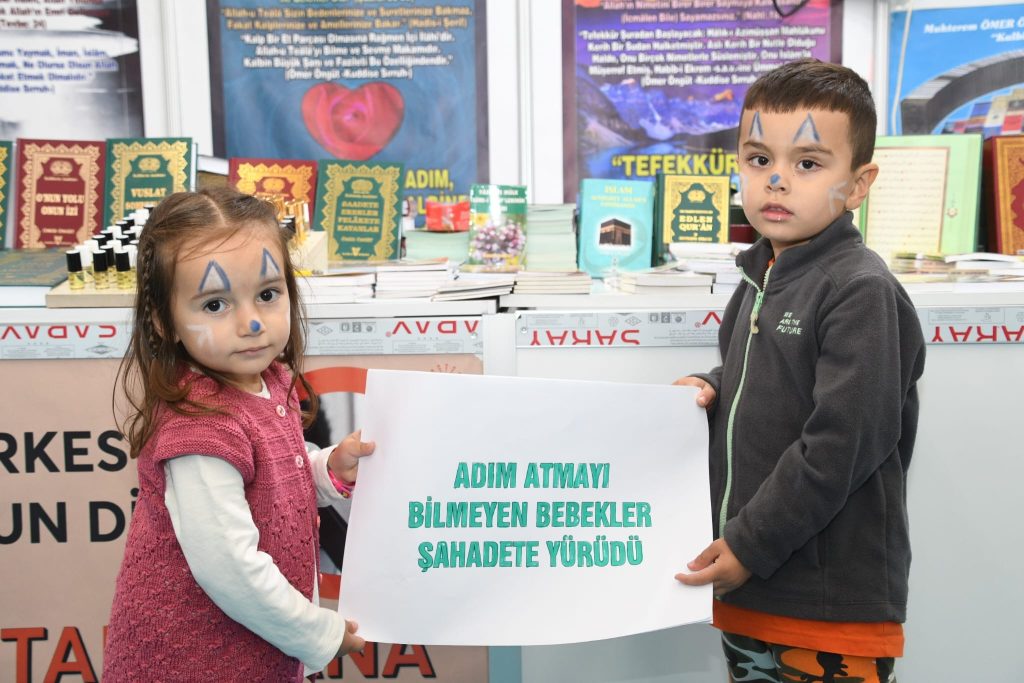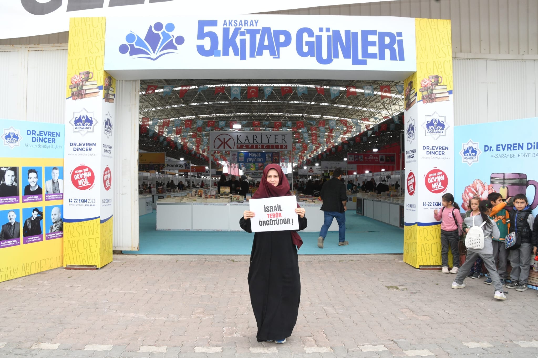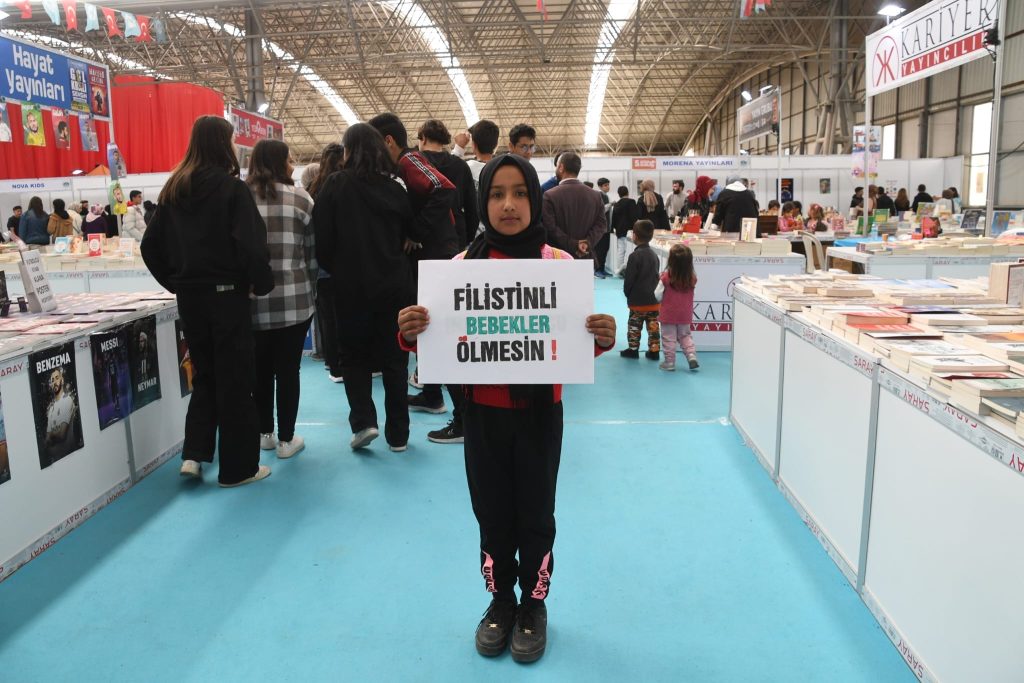 Kitap günlerinin yapıldığı fuar alanını ziyarete gelen birçok genç ve öğrenci ellerinde ‘İsrail Terör Örgütüdür’, ‘Adım Atmayı Bilmeyen Bebekler Şehadete Yürüdü’, ve ‘Filistinli Bebekler Ölmesin’ yazılı pankartlar açarak Filistin’e uygulanan zulmün durdurulması çağrısında bulundular.