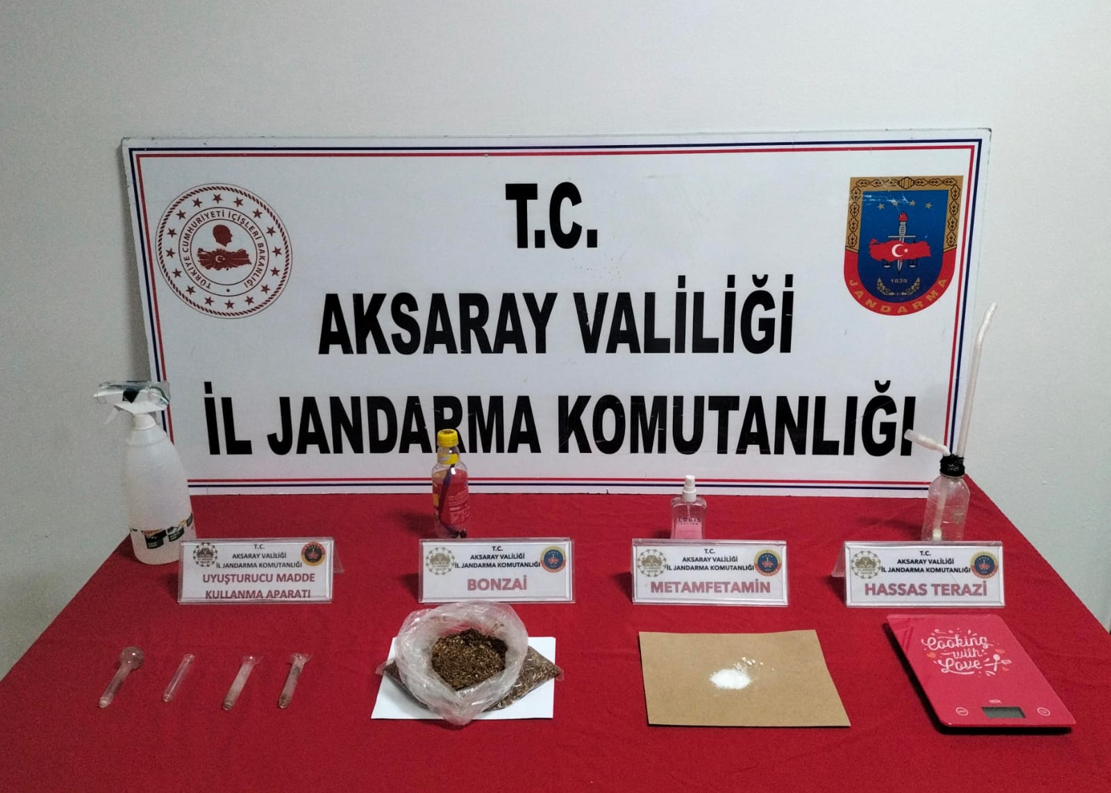 Aksaray İl Jandarma Komutanlığına bağlı KOM ve Asayiş Şube Müdürlüğü ekiplerince yapılan istihbari çalışmalar sonucunda, Uyuşturucu veya Uyarıcı Madde İmal ve Ticareti yaptığı tespit edilen (2) şahsın ikametinde yapılan aramalarda; (150) gram sentetik cannabinoid bonzai, (5) gram metamfetamin, (1) adet hassas terazi, (300) ml amfetamin asetonu ve (6) adet uyuşturucu madde kullanma aparatı ele geçirilmiştir.