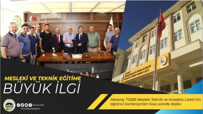 Aksaray Organize Sanayi Bölgesinde bulunan Türkiye Odalar ve Borsalar Birliği (TOBB) Mesleki ve Teknik Anadolu Lisesinin öğrenci kontenjanları kısa sürede doldu. Aksaray Valisi Hamza Aydoğdu’nun girişimleri ile imzalanan protokollerle okulun yemek ve servis hizmeti öğrencilere ücretsiz olarak sağlanacak. Okul öğrencilerine eğitim bursu verilmesinin yanında fabrikalarda stajını yaparak eğitimlerini tamamlayacak öğrenciler için iş garantisi imkanı da sunulacak.