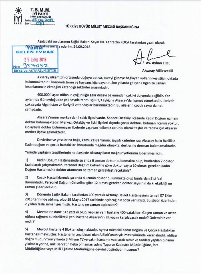 Aksaray Milletvekili Ayhan Erel, Aksaray Eğitim Araştırma hastanesi hakkında Sağlık Bakanı Sayın Dr.Fahrettin Koca’ya cevaplaması için aşağıdaki soru önergesi verdi.