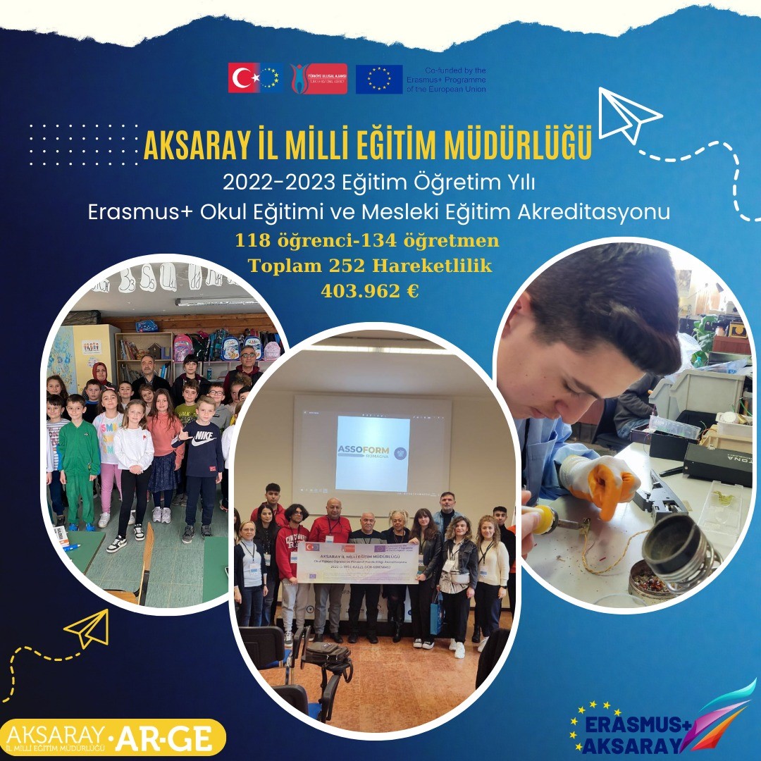 Aksaray İl Milli Eğitim Müdürlüğü tarafından yürütülen Erasmus+ Okul Eğitimi Akreditasyonu ve Mesleki Eğitim Akreditasyonu Projeleri kapsamında 2022-2023 eğitim öğretim yılında 118 öğrenci, 134 öğretmen olmak üzere toplamda 252 kişinin yurt dışı hareketliliği gerçekleştirildi. Projeler kapsamında Avrupa’nın çeşitli ülkelerinde öğrenciler ve öğretmenler işbaşı izleme, öğrenci grup çalışmaları, kısa dönem öğrenci staj faaliyetleri, kurs olmak üzere birçok programda yer aldılar.