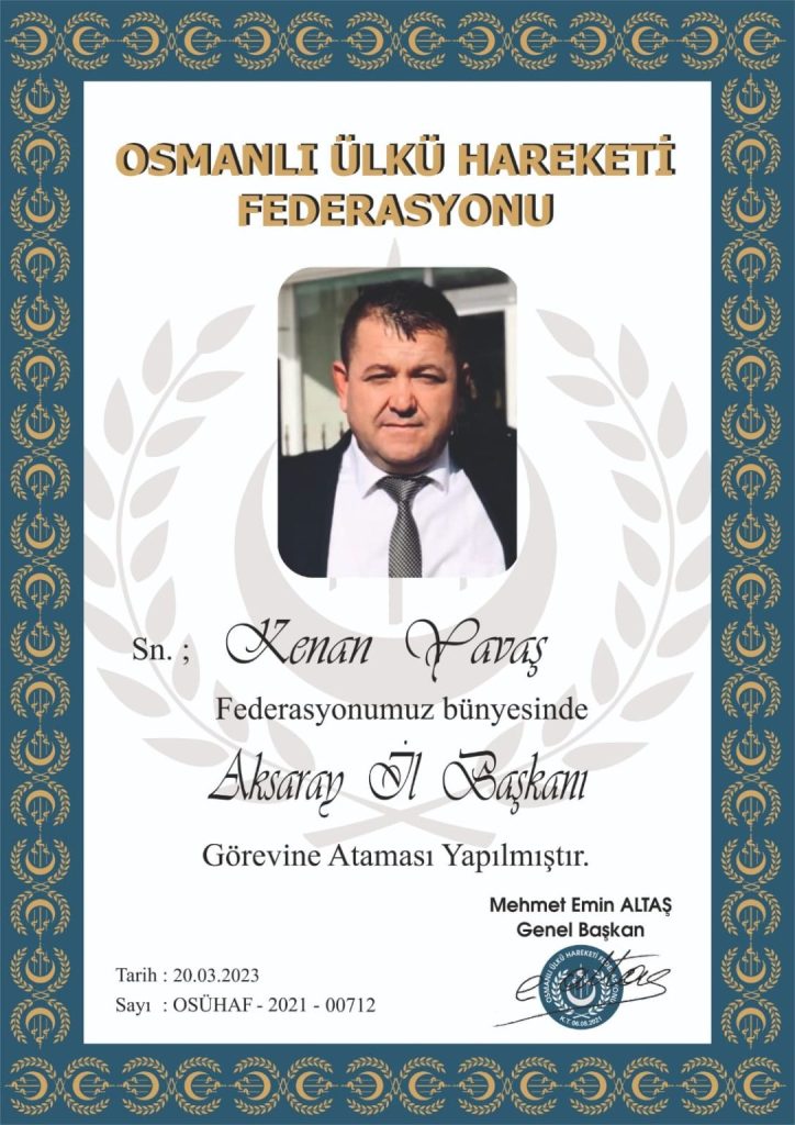 6 Ağustos 2021 tarihinde Mehmet Emin Altaş liderliğinde kurulan Osmanlı Ülkü Hareketi Federasyonu, Aksaray’da bir yapılanmaya giderek İş insanı Kenan Yavaş’ı yeni dönemde Aksaray İl Başkanı olarak atadı. Atama belgesi gönderilen Başkan Kenan Yavaş “Ülkücü camiadan gelen teklife kayıtsız kalamazdım. Osmanlı Ülkü Hareketi Federasyonu Şahsıma Aksaray İl Başkanlığı sorumluluğu tarafıma verilmiş bulunmakta en kısa zamanda Aksaray ve ilçelerimizde teşkilatlanma çalışmalarımızı tamamlayarak hizmet binamızın açılışını yapmak için çalışmalarımıza hız veriyoruz. Aksaraylı tüm dostlarımızı Osmanlı Ülkü Hareketi Federasyonu çatısı altına bekliyoruz. Bilindiği üzere Osmanlı Ülkü Hareketi Federasyonu, 6 Ağustos 2021 tarihinde Mehmet Emin Altaş liderliğinde kurulan ve Türkiye’de faaliyet gösteren bir sivil toplum kuruluşudur. Merkezi Yenimahalle Ankara’dadır. Genel Başkanı Mehmet Emin ALTAŞ’tır. Amacı Osmanlı tarihini, medeniyetini ve kültürünü anlamak, gelecek nesillere anlatmak ve hiçbir siyasi görüş, etnik köken, dil, din, mezhep ayrımı yapmadan herkesi aynı çatı altında toplamaktır..” dedi.
