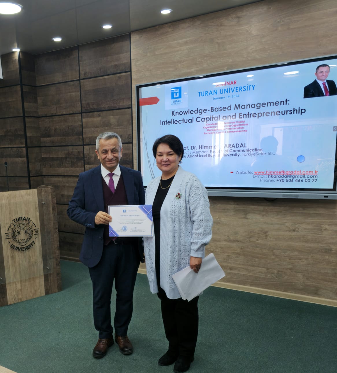 AD Scientific Index 2025 verilerine göre; girişimcilik alanındaki akademisyenler arasında Türkiye’de birinci sırada yer alan Prof. Dr. Himmet Karadal, Turan Üniversitesi’nde “Girişimci Düşünce ve Genç İstihdamı” başlıklı doktora tez savunmasında jüri üyesi olarak görev aldı. Aynı üniversitede doktora öğrencilerine “Bilgiye Dayalı Yönetim: Entelektüel Sermaye ve Girişimcilik” başlıklı bir seminer veren Karadal, entelektüel sermayenin etkin yönetim ve sürdürülebilir girişimcilik açısından taşıdığı stratejik öneme dikkat çekti. Program sonunda Turan Üniversitesi Rektörü Prof. Dr. Rakhman A. Alshanov ve Rektör Yrd. Prof. Dr. Gulzhanat Tayauova tarafından kendisine teşekkür belgesi takdim edildi.